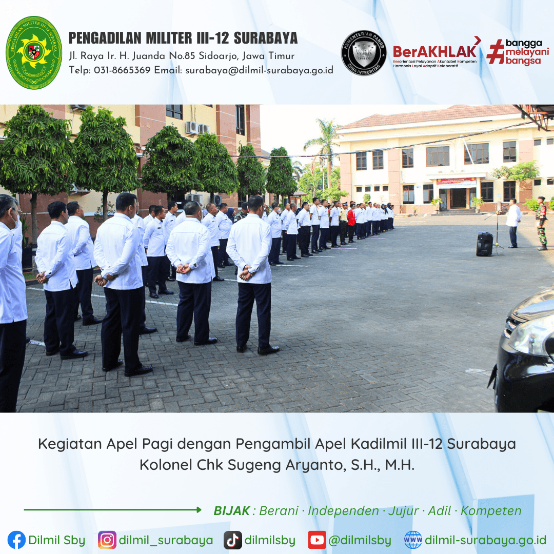 Pada hari Senin tanggal 24 Juli 2023 dilaksanakan kegiatan apel gabungan yang diikuti oleh seluruh anggota Dilmil III-12 Surabaya dan Dilmilti III Surabaya. Apel pagi dipimpin oleh Kepala Pengadilan Militer III-12 Surabaya Kolonel Chk Sugeng Aryanto, S.H., M.H.