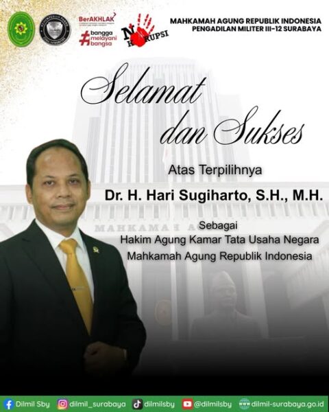In Berita Comment off Keluarga Besar Pengadilan Militer III-12 Surabaya menyampaikan selamat dan sukses atas terpilihnya Bapak Dr. H. Hari Sugiharto, S.H., M.H. sebagai Hakim Agung Kamar Tata Usaha Negara Mahkamah Agung Republik Indonesia