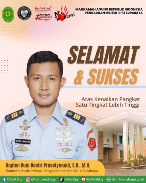In Berita Comment off Selamat atas Kenaikan Pangkat Satu Tingkat Lebih Tinggi kepada Panitera Muda Pidana Pengadilan Militer III-12 Surabaya Kapten Kum Destri Prasetyoandi, S.H., M.H.