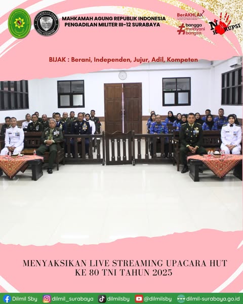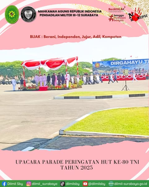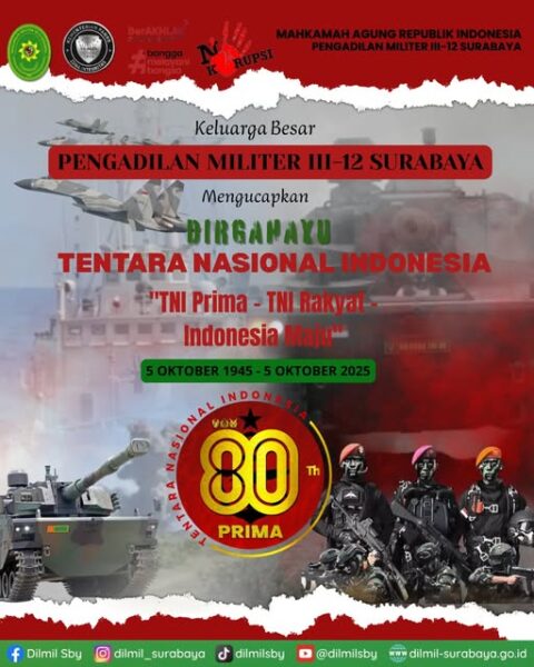 In Berita Comment off Keluarga Besar Pengadilan Militer III-12 Surabaya mengucapkan Dirgahayu Tentara Nasional Indonesia “TNI Prima, TNI Rakyat, Indonesia Maju”.