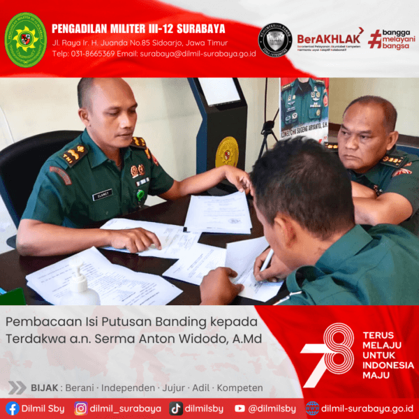 In Berita Comment off Kegiatan Pemberitahuan Isi Putusan Banding a.n. Terdakwa Serma Anton Widodo, A.Md.