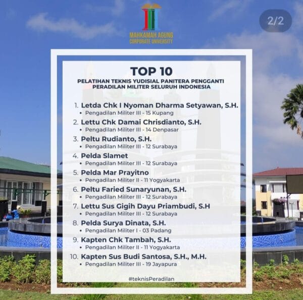 In Berita Comment off Selamat dan Sukses kepada Panitera Pengganti telah meraih TOP 10 pada Pelatihan Teknis Yudisial Panitera Pengganti Peradilan Militer Seluruh Indonesia
