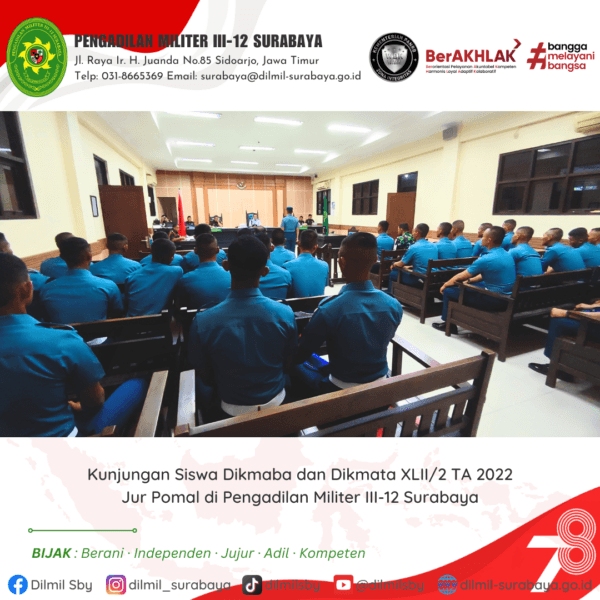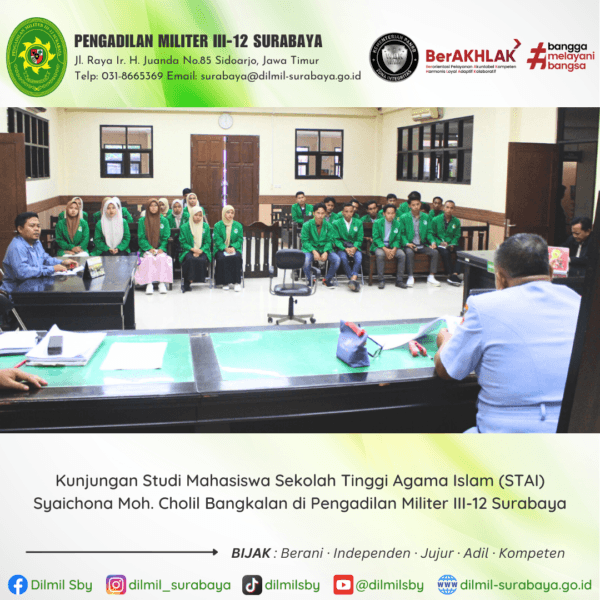 In Berita Comment off Para mahasiswa dari Program Studi Hukum Pidana Islam Sekolah Tinggi Agama Islam (STAI) Syaichona Moh. Cholil Bangkalan datang untuk melakukan kunjungan studi ke Pengadilan Militer III-12 Surabaya