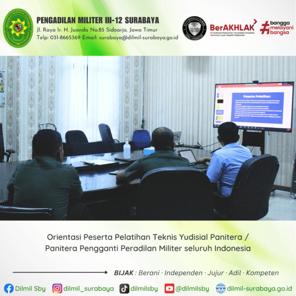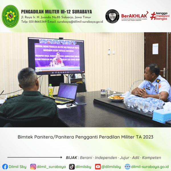 In Berita Comment off Kegiatan Bimbingan Teknis Panitera Daring Meningkatkan Kompetensi dan Profesionalisme Panitera/Panitera Pengganti dalam Pengajuan Upaya Hukum di Lingkungan Peradilan Militer Tahun Anggaran 2023