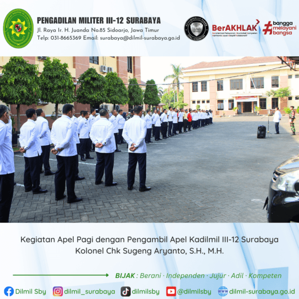 In Berita Comment off Apel pagi dipimpin oleh Kepala Pengadilan Militer III-12 Surabaya Kolonel Chk Sugeng Aryanto, S.H., M.H.