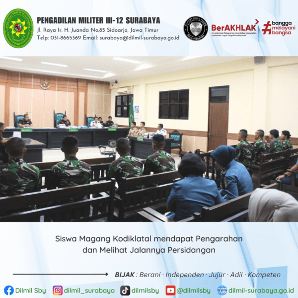 In Berita Comment off Kunjungan Para Siswa Magang dari Kodiklatal datang ke Pengadilan Militer III-12 Surabaya untuk melihat persidangan