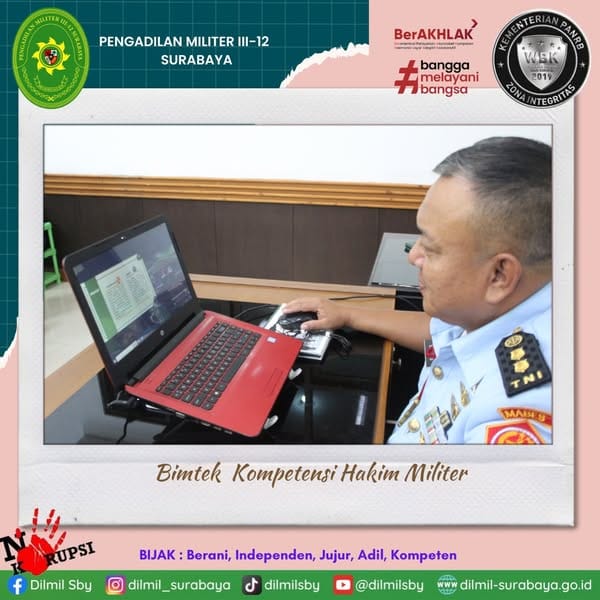 Hakim Militer Pengadilan Militer III-12 Surabaya Letnan Kolonel Wing Eko Joedha H. S.H.,M.H, Letnan Kolonel Arif Sudibya, S.H.,M.H dan Mayor Laut (H/W) Lidiya, S.H.,M.H mengikuti kegiatan Bimtek Kompetensi Hakim di Lingkungan Peradilan Militer yang memiliki tema “Bimbingan Teknis Pelaksanaan Pidana Bersyarat Dalam Sistem Pemidanaan di Lingkungan Peradilan Militer TA. 2024”.