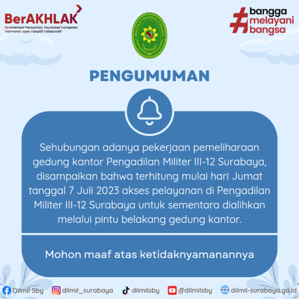 In Pengumuman Comment off Pelayanan di Pengadilan Militer III-12 Surabaya dialihkan melalui pintu belakang