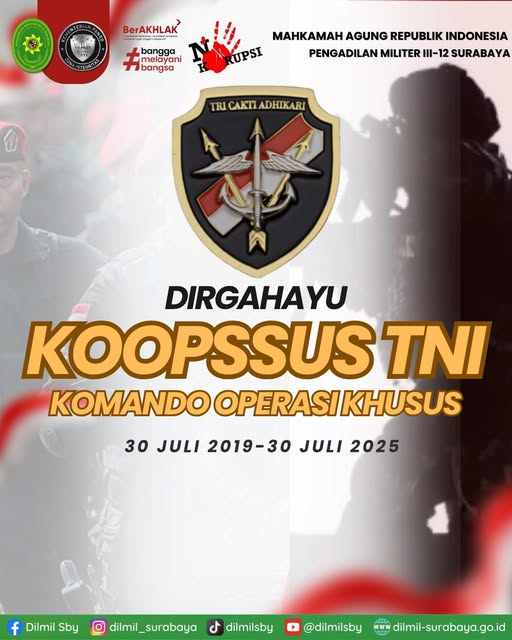 Kepala Pengadilan Militer III-12 Surabaya Kolonel Laut (H) Amriandie, S.H., M.H beserta seluruh personel mengucapkan Dirgahayu Koopssus TNI.