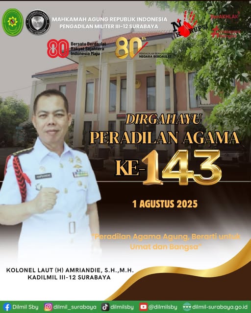 01/08/2025 - In Berita By Dilmil III-12 Admin 2 Comment off Dirgahayu Peradilan Agama Ke 143 Kepala Pengadilan Militer III-12 Surabaya Kolonel Laut (H) Amriandie, S.H., M.H beserta seluruh personel mengucapkan Dirgahayu Peradilan Agama Ke 143 ” Peradilan Agama Agung, Berarti Untuk Umat dan Bangsa”.#dilmil #dilmilsby #dilmilsurabaya #pengadilan #Peradilan #pengadilanmiliter #pengadilanmilitersurabaya #berakhlak #ASNBerAKHLAK #BanggaMelayaniBangsa #ReformasiBirokrasi #WBKWBBM #kemenPANRB #mahkamahagungRI #zonaintegritas #wilayahbebaskorupsi #wbk Previous Pembukaan Pekan Olahraga Hari Ulang Tahun ke-80 Kemerdekaan Republik Indonesia dan Hari Ulang Tahun ke-80 Next Kegiatan pembahasan usul desain pakaian sidang Hakim pada Pengadilan Militer