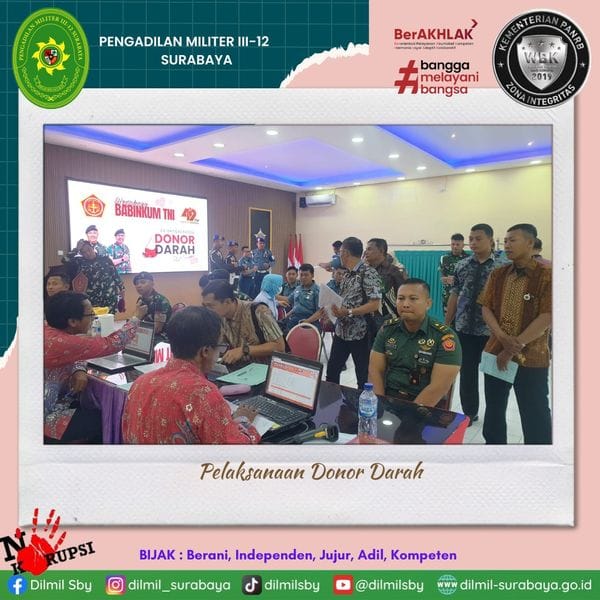 Hakim Militer Pengadilan Militer III-12 Surabaya beserta perwakilan personel Pengadilan Militer III-12 Surabaya mengikuti kegiatan donor darah dalam rangka memperingati HUT-49 Babinkum TNI Tahun 2024 yang dilaksanakan di aula Oditurat Militer Surabaya.