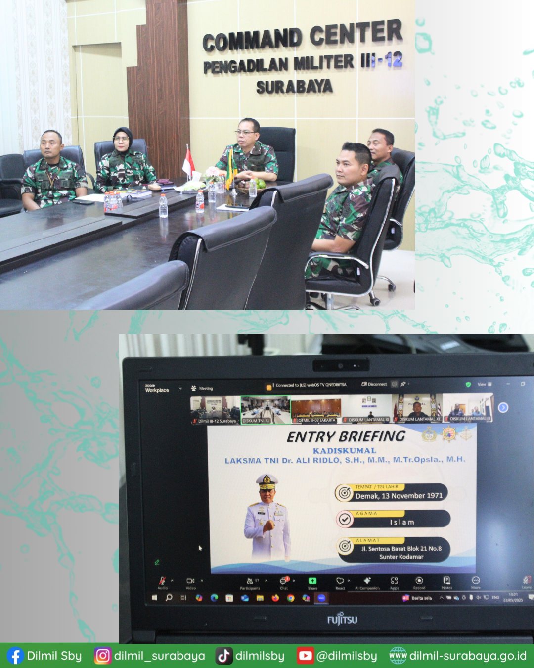 Bertempat diruang command center Kepala Pengadilan Militer III-12 Surabaya Kolonel Laut (H) Amriandie, S.H., M.H. beserta Hakim Militer Letkol Laut (H/W) Lidiya, S.H., M.H, Mayor Laut (H) Ruslan, S.H., M.H. beserta Calon Hakim Militer Mayor Laut (H) Tono Novianto, S.H., M.H. dan Mayor Laut (H) Mayor Kasman Yori Harefa, S.H., M.H mengikuti kegiatan Entry Briefing Kadiskumal Laksma TNI Dr. M. Ali Ridho, S.H., M.M., M. Tr.Opsla., M.H. kegiatan dilaksanakan secara daring.