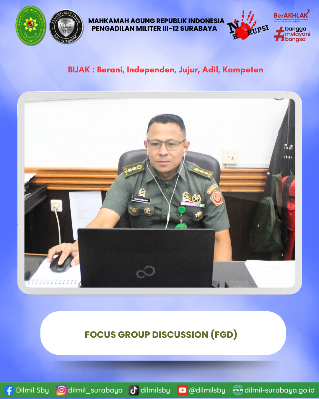 Hakim Militer Pengadilan Militer III-12 Surabaya Letnan Kolonel Chk Muhammad Arif Sumarsono, S.H., M.H. mengikuti kegiatan Focus Group Discussion (FGD) “Revisi Hukum Acara Pidana Militer” yang diselenggarakan oleh Pusat Strategi dan Kebijakan Hukum dan Peradilan Mahkamah Agung RI secara virtual.