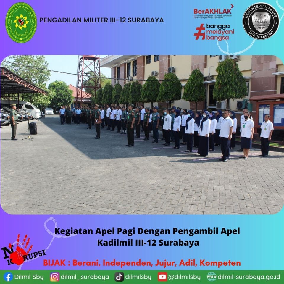 Pada hari Senin tanggal 20 November 2023 dilaksanakan kegiatan apel gabungan yang diikuti oleh seluruh anggota Dilmil III-12 Surabaya dan Dilmilti III Surabaya. Apel pagi dipimpin oleh Kepala Pengadilan Militer III-12 Surabaya Kolonel Chk Sugeng Aryanto, S.H., M.H.