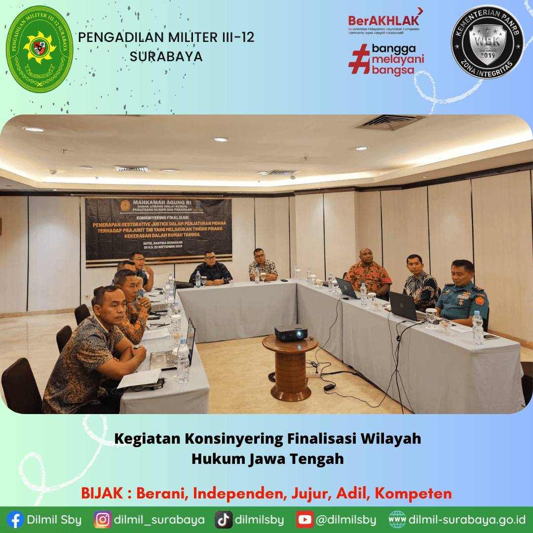Hakim Pengadilan Militer III-12 Surabaya Mayor Laut (H) Mirza Ardiansyah, S.H., M.H., M.A.P mengikuti kegiatan Konsinyering Finalisasi Wilayah Hukum Jawa Tengah dengan judul ” Penerapan Restorative Justice dalam Penjatuhan Pidana Terhadap Prajurit TNI Yang Melakukan Tindak Pidana Kekerasan Dalam Rumah Tangga”.