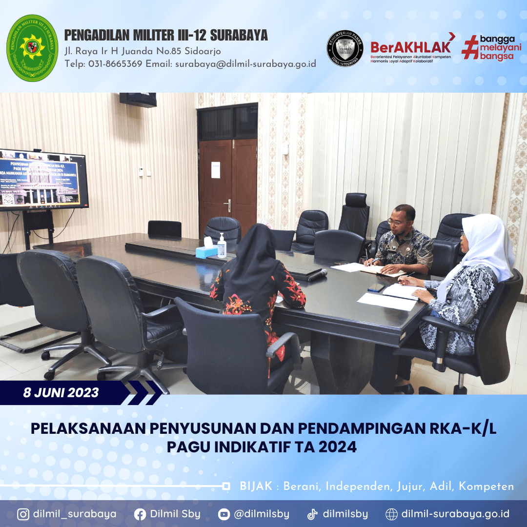 Sekretaris Dilmil III-12 Surabaya PNS Firda Nuril Hanifah, S.Si beserta Kasubbag Umum dan Keuangan PNS Ainur Rofiq, S.E. dan Kasubbag PTIP PNS Melanti Puspara, S.E. mengikuti kegiatan Pelaksanaan Penyusunan dan Pendampingan RKA-K/L Pagu Indikatif TA 2024 secara video conference melalui zoom meeting di Ruang Rapat Pengadilan Militer III-12 Surabaya.