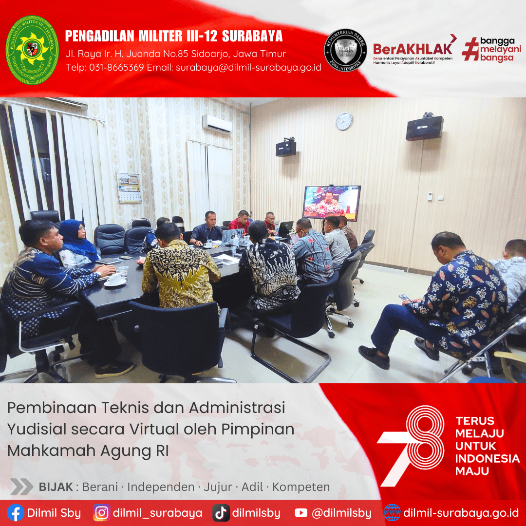 #dilmil #dilmilsby #dilmilsurabaya #pengadilan #Peradilan #pengadilanmiliter #pengadilanmilitersurabaya #berakhlak #ASNBerAKHLAK #BanggaMelayaniBangsa #ReformasiBirokrasi #WBKWBBM #kemenPANRB #mahkamahagungRI #zonaintegritas #wilayahbebaskorupsi #wbk #bintek #pembinaanteknis #administrasi #yudisial #virtual #zoommeeting
