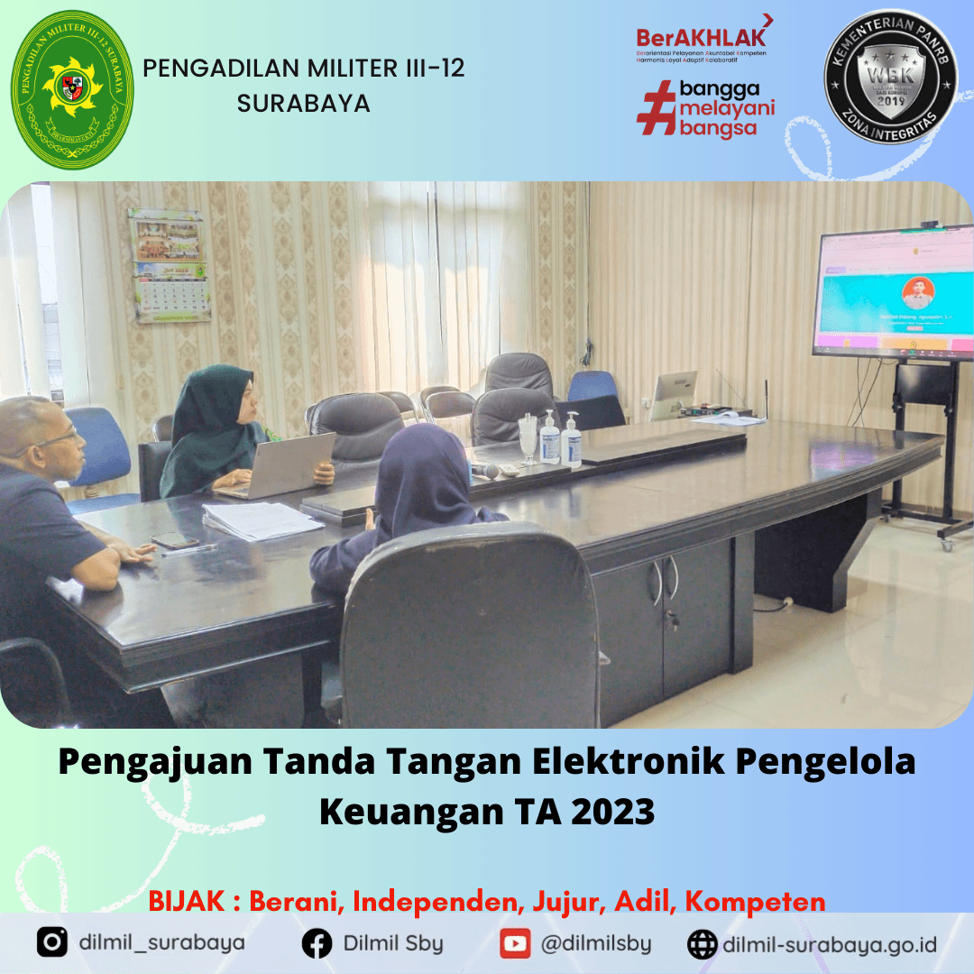 Bertempat diruang rapat Pengadilan Militer III-12 Surabaya Kepala Sub Bagian Umum dan Keuangan PNS Ainur Rofiq, S.E sebagai PPK beserta Bendahara dan PPSPM mengikuti kegiatan Pengajuan Tanda Tangan Elektronik Pengelola Keuangan Tahun Anggaran 2023 secara daring.