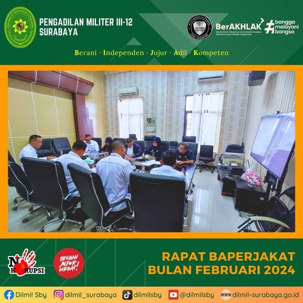 Pada hari Rabu tanggal 7 Februari 2024 dilaksanakan kegiatan Rapat Badan Pertimbangan Jabatan dan Kepangkatan (BAPERJAKAT). Kegiatan yang dilaksanakan di Ruang Command Center Pengadilan Militer III-12 Surabaya ini dipimpin oleh Wakadilmil III-12 dan dihadiri oleh seluruh Tim BAPERJAKAT.