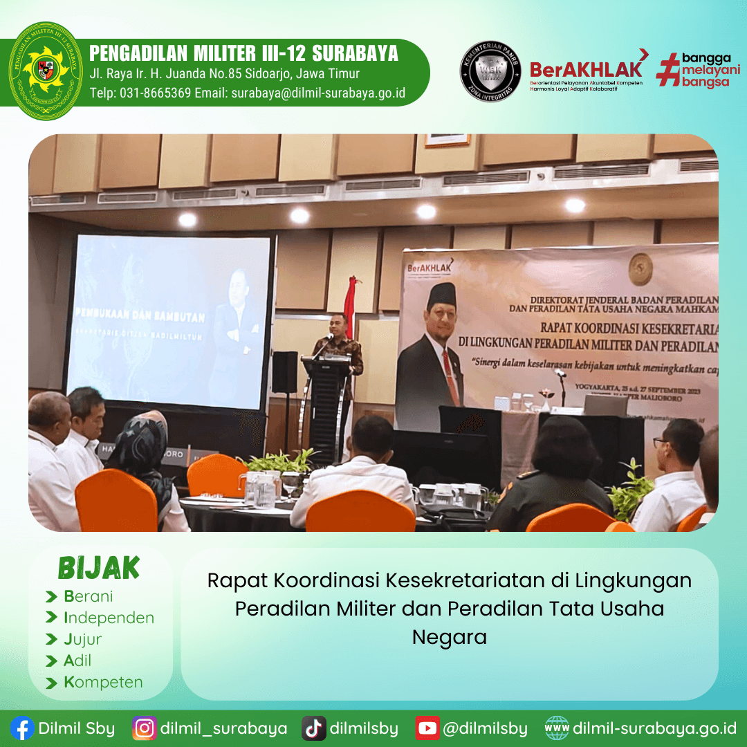 Sekretaris Pengadilan Militer III-12 Surabaya PNS Firda Nuril Hanifah, S.Si mengikuti kegiatan Rapat Koordinasi Kesekretariatan di Lingkungan Peradilan Militer dan Peradilan Tata Usaha Negara secara luring di Hotel Harper Malioboro Yogyakarta mulai tanggal 25 s.d. 27 September 2023.