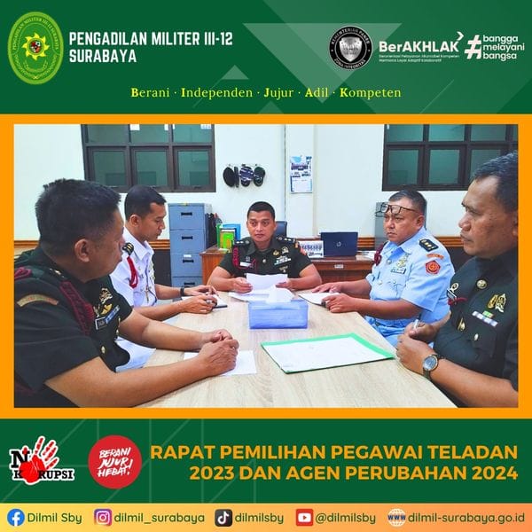 Tim Pemilihan Pegawai Teladan dan Agen Perubahan; dalam hal ini seluruh Hakim Militer; melaksanakan kegiatan rapat pemilihan Pegawai Teladan periode Tahun 2023 dan pemilihan Tim Agen Perubahan periode Tahun 2024. Kegiatan ini dilaksanakan di Ruang Hakim Pengadilan Militer III-12 Surabaya.