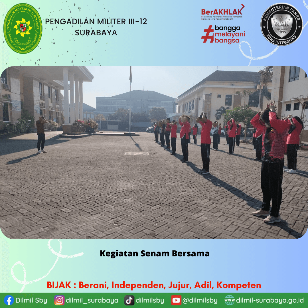 Seluruh anggota Pengadilan Militer III-12 Surabaya dan Pengadilan Militer Tinggi III Surabaya melaksanakan kegiatan olahraga dan senam bersama. Kegiatan olahraga rutin dilaksanakan setiap hari Selasa dan Jum’at. Dengan berolahraga secara rutin diharapkan setiap anggota memiliki badan yang sehat dan bugar serta pikiran yang jernih agar dapat melaksanakan tugas dan kewajiban dengan baik.
