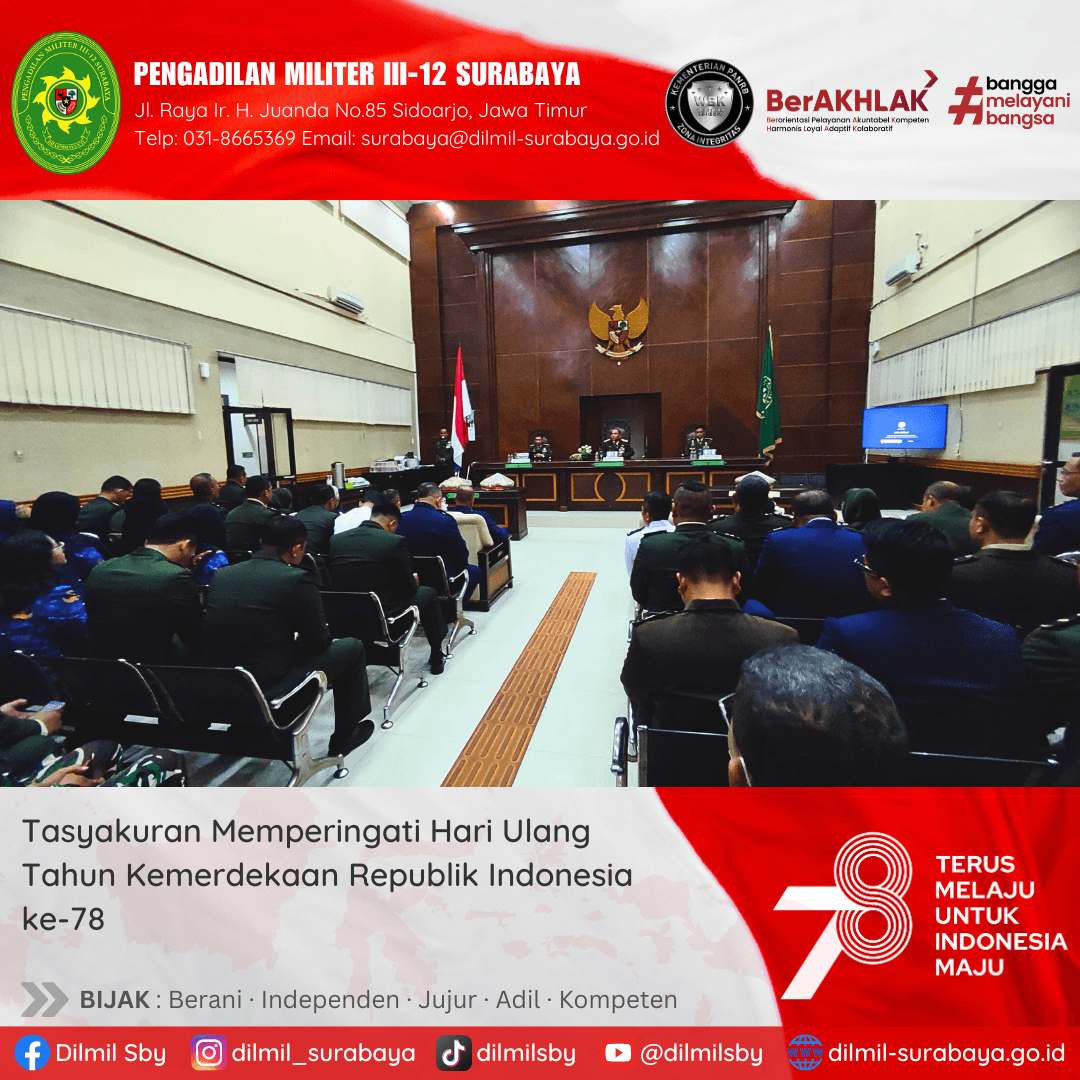 Seluruh anggota Pengadilan Militer Tinggi III Surabaya dan Pengadilan Militer III-12 Surabaya mengikuti kegiatan tasyakuran dengan potong tumpeng memperingati Hari Ulang Tahun Kemerdekaan Republik Indonesia ke-78 di Ruang Sidang Utama Pengadilan Militer Tinggi III Surabaya.