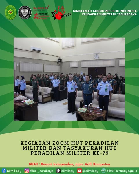 Seluruh personel Pengadilan Militer III-12 Surabaya mengikuti kegiatan zoom HUT Peradilan Militer dan tasyakuran HUT Peradilan Militer ke-79 di ruang sidang tirta Pengadilan Militer Tinggi III Surabaya.