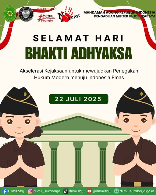 22/07/2025 - In Berita By Dilmil III-12 Admin 2 Comment off Keluarga besar Pengadilan Militer III-12 Surabaya mengucapkan Selamat hari Bhakti Adhyaksa Previous Penyerahan Bantuan Dana Bea Siswa (BDBS) oleh Dharmayukti Karini Cabang Surabaya Next Sosialisasi tentang Peluang dan Pemanfaatan Rumah Subsidi Pemerintah di Lingkungan Mahkamah Agung dan badan peradilan dibawahnya