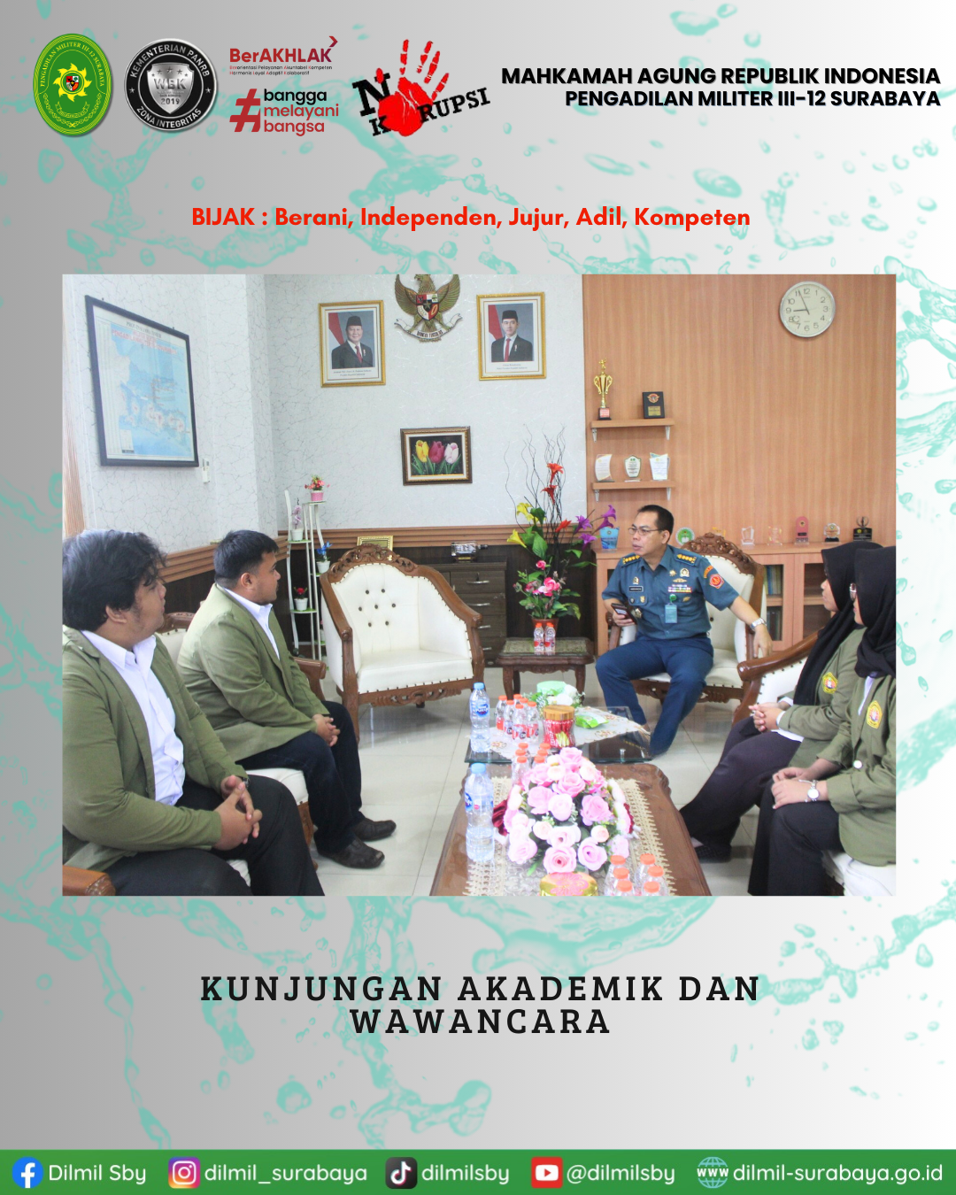 Muhammad Yasser, M. Iqbal Dzaky, Attahirah Hariswari dan Raddine Nur Haliza Mahasiswa Fakultas Hukum UPN “Veteran” Jawa Timur melakukan kunjungan akademik dan wawancara mata kuliah hukum ketahanan negara dan hukum laut di Pengadilan Militer III-12 Surabaya. Dalam kesempatan ini Kepala Pengadilan Militer III-12 Surabaya Kolonel Laut (H) Amriandie, S.H., M.H. memberikan pengetahuan tentang hukum ketahanan negara dan hukum laut kepada para mahasiswa fakultas Hukum UPN “Veteran”
