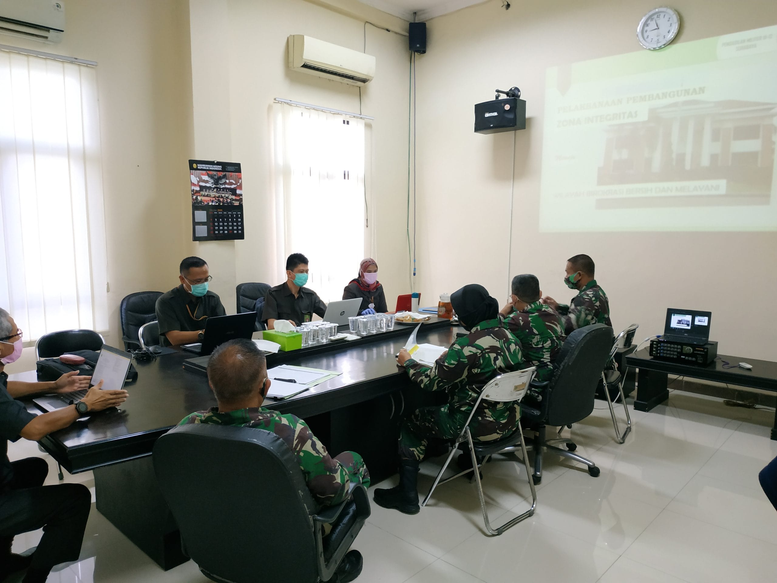 Sidoarjo, pada hari Senin tanggal 19 Oktober 2020 Kepala Pengadilan Militer III-12 Surabaya Kolonel Chk Sugiarto, SH menerima kunjungan dari Badan Pengawasan Mahkamah Agung RI sesuai dengan Surat Tugas Nomor : 206/BP/ST/IV/2020 tanggal 27 Arpil 2020 menugaskan kepada A. Syaifullah Hakim Tinggi Pengawas sebagai Ketua Pemeriksa, Mayor Sus Jonarku Hakim Yustisial sebagai Anggota, Yugus Dwi prasetyo Auditor sebagai Auditor/Sekretaris, Dewi Nurqolbi Triastuti Kasub Kelembagaan dan Pelaporan sebagai Anggota. Tim Pengawas melakukan pemeriksaan Monitoring Wilayah Bebas dari Korupsi (WBK menuju Wilayah Birokrasi Bersih dan Melayani (WBBM) pada Pengadilan Militer III-12 Surabaya yang dilaksanakan selama 5 (lima) hari pada tanggal 19 s/d 23 Oktober 2020