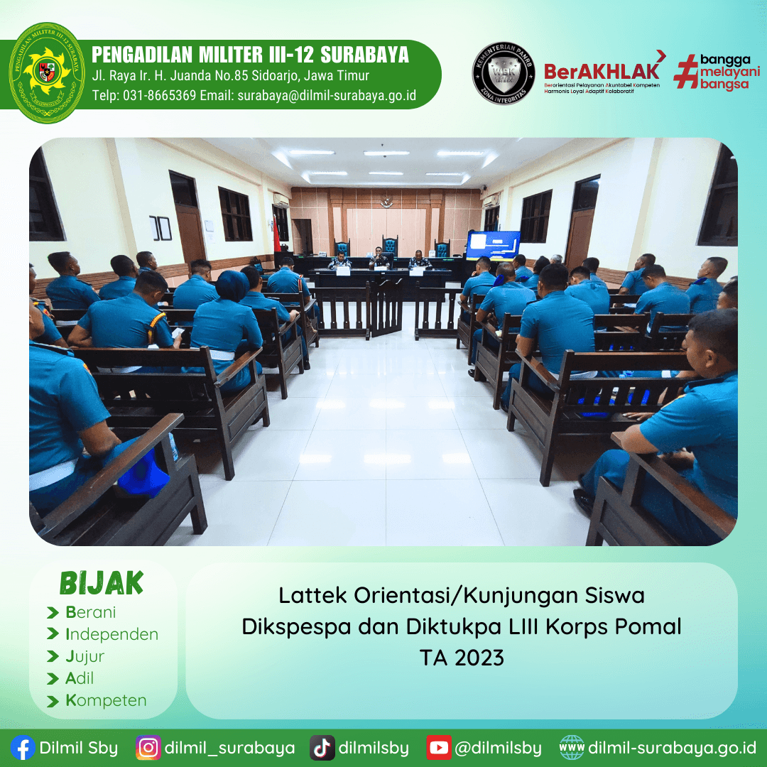 Pada hari Kamis tanggal 14 September 2023 Pengadilan Militer III-12 Surabaya menerima kunjungan dari Siswa Dikspespa dan Diktukpa LIII Korps Pomal TA 2023. Kunjungan ini dalam rangka Latihan Praktek (Lattek) Orientasi.