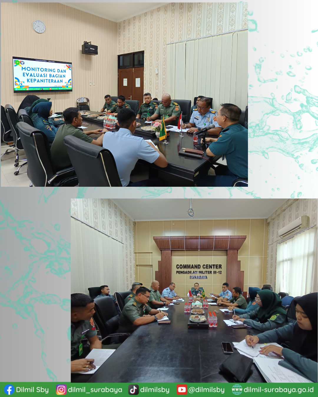 Bertempat diruang command center Pengadilan Militer III-12 Surabaya dilaksanakan kegiatan monitoring dan evaluasi bagian kepaniteraan yang dihadiri seluruh personel kesekretariatan. Kegiatan monev bagian kepaniteraan dipimpin langsung oleh Kepala Pengadilan Militer III-12 Surabaya Kolonel Laut (H) Amriandie, S.H.,M.H.