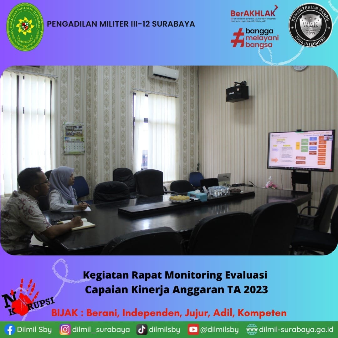 Rapat Monitoring Evaluasi Capaian Kinerja Anggaran Tahun 2023 diselenggarakan oleh Biro Perencanaan dan Organisasi Mahkamah Agung Republik Indonesia ini bertujuan untuk melakukan pemantauan dan evaluasi terhadap Satuan Kerja yang capaian kinerja anggarannya masih di bawah 85 persen hingga tanggal 14 November 2023.