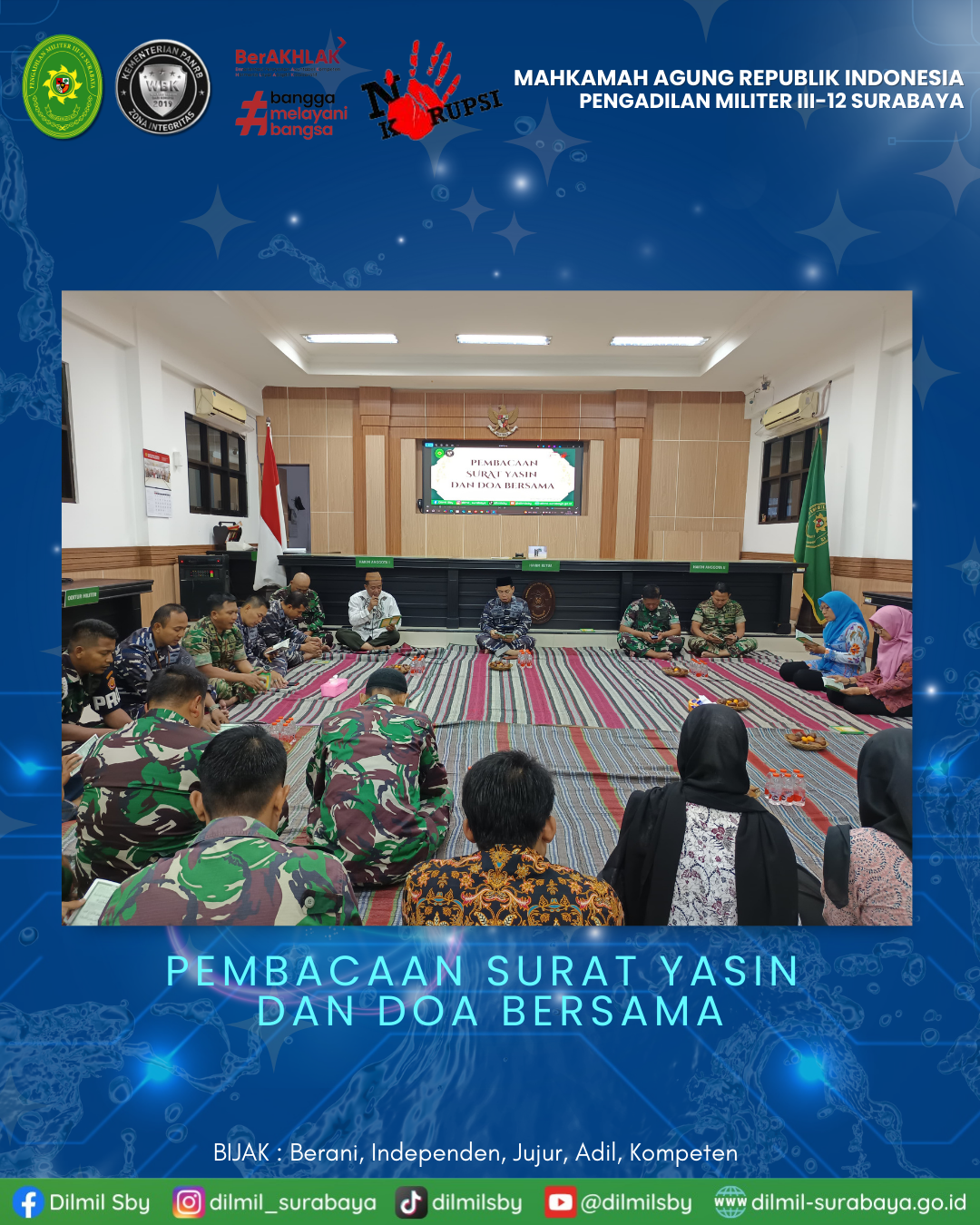 Seluruh anggota Pengadilan Militer III-12 Surabaya yang beragama Islam mengikuti kegiatan pembacaan surat yasin dan doa bersama. Kegiatan yang dipimpin langsung oleh Kepala Pengadilan Militer III-12 Surabaya Kolonel Laut (H) Amriandie, S.H.,M.H ini dilaksanakan di Ruang Sidang Cakra Pengadilan Militer III-12 Surabaya. Semoga dengan kegiatan ini seluruh anggota mendapatkan keberkahan. Aamiin.