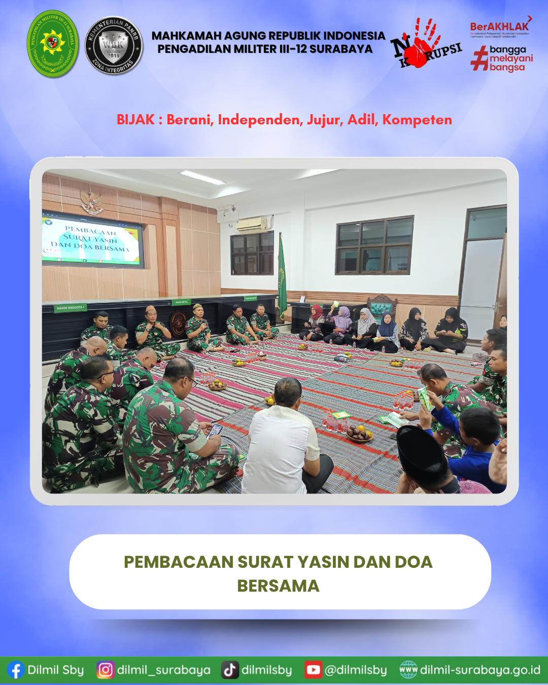 Seluruh personel Pengadilan Militer III-12 Surabaya dan mahasiswa magang yang beragama Islam mengikuti kegiatan pembacaan surat yasin dan doa bersama. Kegiatan yang dipimpin langsung oleh Kepala Pengadilan Militer III-12 Surabaya Kolonel Laut (H) Amriandie, S.H.,M.H ini dilaksanakan di Ruang Sidang Cakra Pengadilan Militer III-12 Surabaya. Semoga dengan kegiatan ini seluruh personel mendapatkan keberkahan. Aamiin.