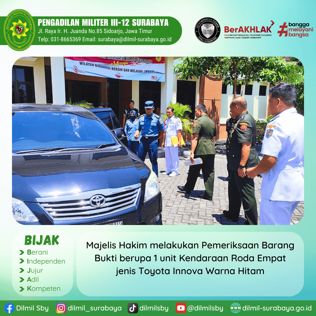 Majelis Hakim melakukan pemeriksaan barang bukti berupa 1 (satu) unit kendaraan roda empat jenis Toyota Innova warna hitam di halaman belakang kantor Pengadilan Militer III-12 Surabaya. Pemeriksaan barang bukti ini disaksikan oleh Oditur dan para Saksi.
