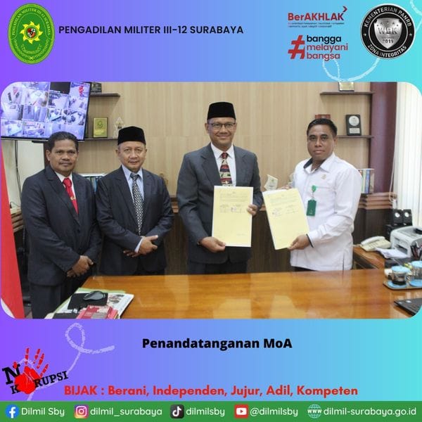 Kepala Pengadilan Militer III-12 Surabaya didampingi Kasubbag Kepegawaian dan Ortala melaksanakan Penandatanganan Memorandum Of Agreement (MoA) antara Pengadilan Militer III-12 Surabaya dengan Universitas Islam Negeri Malang. Kegiatan ini dilaksanakan di Ruang Kepala Pengadilan Militer III-12 Surabaya.