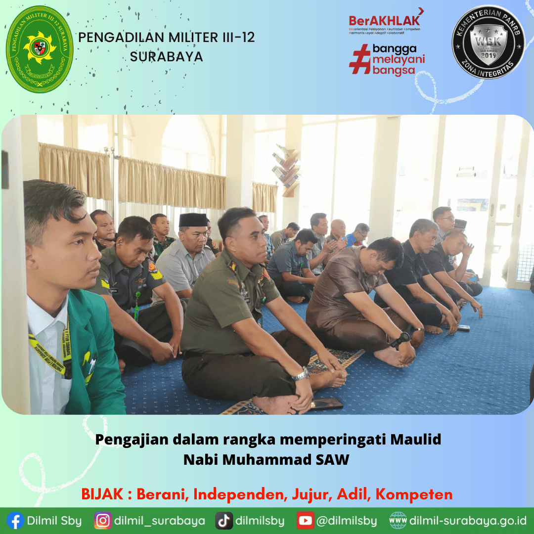 Seluruh personel Pengadilan Militer III-12 Surabaya mengikuti kegiatan Pengajian dalam rangka memperingati Maulid Nabi Muhammad SAW 1445H yang dilaksanakan di Masjid Al-Ikhlas Dilmiltun Surabaya. Ceramah Agama disampaikan oleh KH. Masruchin, Pengasuh Pondok Pesantren Miftahul Arifin Candi Sidoarjo.