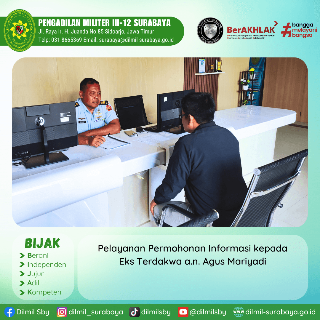 Petugas Pelayanan Terpadu Satu Pintu (PTSP) memberikan pelayanan berupa pemberian salinan Putusan Tingkat Kasasi serta Akte Pemberitahuan Isi Putusan Kasasi (APIK) kepada eks-Terdakwa a.n. Agus Mariyadi. Sebelumnya, Bapak Agus Mariyadi telah mengisi Formulir Permohonan Informasi untuk mendapatkan salinan Putusan tersebut. Pemberian salinan Putusan ini diserahkan langsung oleh Panitera Kapten Sus Kholip, S.H. kepada yang bersangkutan guna pengurusan Surat Keputusan Pemberhentian dengan Tidak Hormat (PTDH) dari Kepala Staf Angkatan Darat (KSAD).