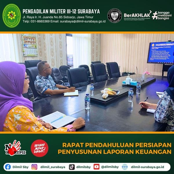 Sekretaris Pengadilan Militer III-12 Surabaya didampingi Kasubbag Umum dan keuangan beserta staf mengikuti Rapat Pendahuluan Persiapan Penyusunan Laporan Keuangan Mahkamah Agung RI Tahun 2023. Kegiatan ini dilaksanakan secara daring di Ruang Command Center Pengadilan Militer III-12 Surabaya.