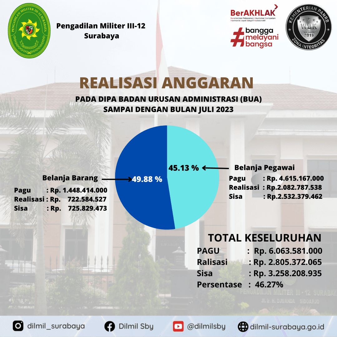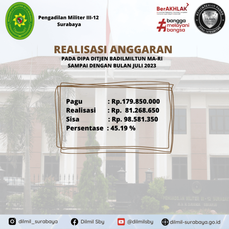 01/08/2023 - In Berita By Dilmil III-12 Admin 2 Comment off Realisasi Anggaran sampai dengan Bulan Juli 2023 Realisasi Anggaran sampai dengan Bulan Juli 2023 untuk Dipa Badan Urusan Administrasi (BUA) dan Dipa Ditjen Badilmiltun MA-RI Pada Pengadilan Militer III-12 Surabaya Previous Rapat Bulanan bagian Kesekretariatan Next Selamat Hari Raya Galungan lan Kuningan 2023