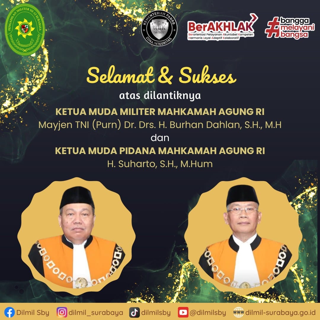 Keluarga Besar Pengadilan Militer III-12 Surabaya mengucapkan Selamat dan Sukses atas dilantiknya Ketua Muda Militer Mahkamah Agung RI Mayjen TNI (Purn) Dr. Drs. H. Burhan Dahlan, S.H., M.H. dan Ketua Muda Pidana Mahkamah Agung RI H. Suharto, S.H., M.Hum.