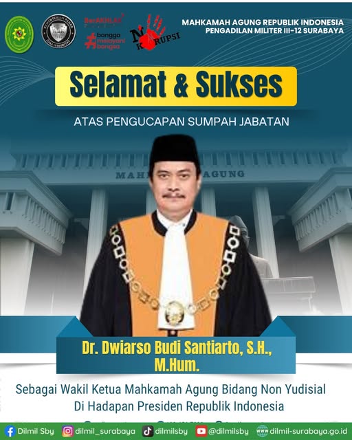 11/11/2025 - In Berita By Dilmil III-12 Admin 2 Comment off Selamat dan Sukses Atas Pengucapan Sumpah Jabatan Keluarga Besar Pengadilan Militer III-12 SurabayaMengucapkan:Selamat dan SuksesAtas Pengucapan Sumpah JabatanWakil Ketua Mahkamah Agung Bidang Non YudisialYM. Dr. Dwiarso Budi Santiarto, S.H., M.Hum.Di Hadapan Presiden Republik Indonesia.#dilmil #dilmilsby #dilmilsurabaya #pengadilan #Peradilan #pengadilanmiliter #pengadilanmilitersurabaya #berakhlak #ASNBerAKHLAK #BanggaMelayaniBangsa #ReformasiBirokrasi #WBKWBBM #kemenPANRB #mahkamahagungRI #zonaintegritas #wilayahbebaskorupsi #wbk Previous Keluarga Besar Pengadilan Militer III-12 Surabaya mengucapkan selamat hari Pahlawan. Next Pelaksanaan Sidang Online