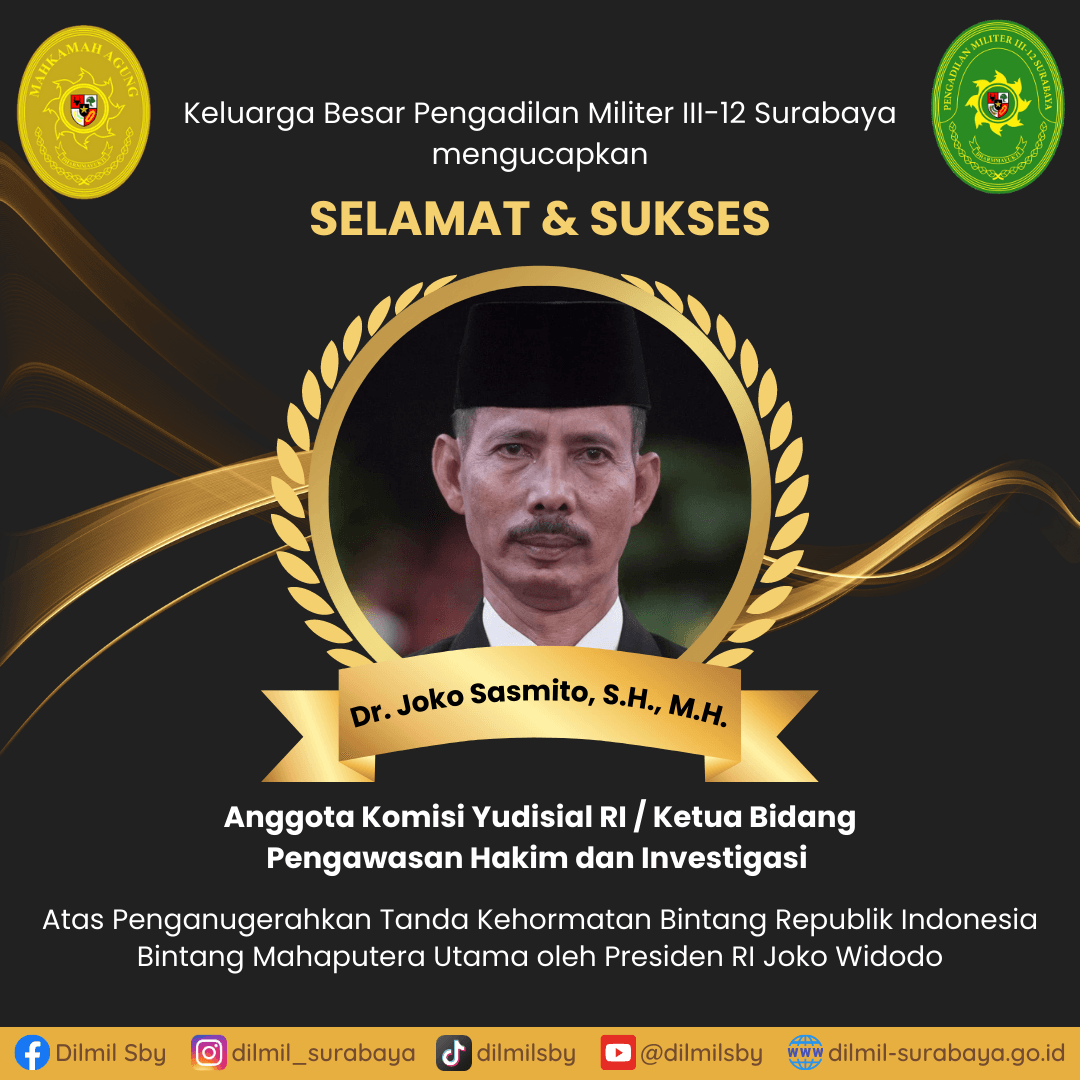 Kepala Pengadilan Militer III-12 Surabaya Kolonel Chk Sugeng Aryanto, S.H. beserta seluruh anggota mengucapkan Selamat dan Sukses kepada Dr. Joko Sasmito, S.H., M.H. Anggota Komisi Yudisial RI / Ketua Bidang Pengawasan Hakim dan Investigasi atas penganugerahkan Tanda Kehormatan Bintang Republik Indonesia Bintang Mahaputera Utama oleh Presiden RI Joko Widodo.