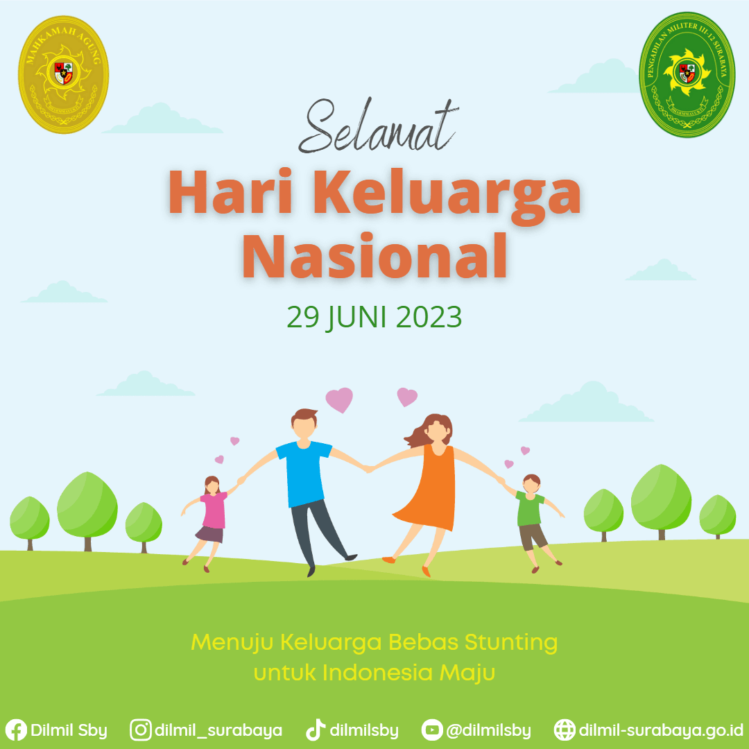 Keluarga besar Pengadilan Militer III-12 Surabaya mengucapkan, “Selamat Memperingati Hari Keluarga Nasional ke-30”. Hari Keluarga Nasional (Harganas) diperingati setiap tanggal 29 Juni. Tema yang diusung untuk Hari Keluarga Nasional di tahun 2023 ini adalah “Menuju Keluarga Bebas Stunting Untuk Indonesia Maju”. Hari Keluarga Nasional 2023 juga diharapkan menjadi ruang untuk memperkuat langkah dalam mencegah dan menuntaskan persoalan stunting di Indonesia.
