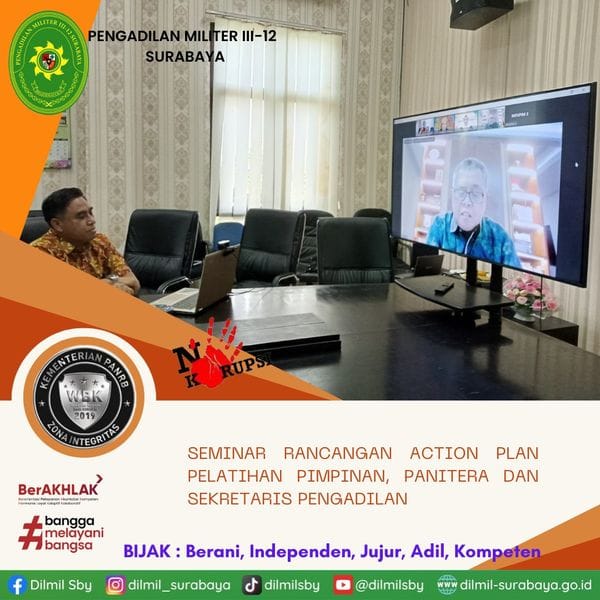 Hakim Militer Mayor Laut (H) Mirza Ardiansyah, S.H.,M.H.,M.AP, Panitera Kapten Kum Kholip, S.H dan Sekretaris Firda Nuril Hanifah, S.Si.,M.PSDM mengikuti seminar rancangan action plan Pelatihan Pimpinan, Panitera dan Sekretaris Pengadilan. Kepala Pengadilan Militer III-12 Surabaya Kolonel Chk Sugeng Aryanto, S.H.,M.H. bertindak sebagai mentor dalam pelatihan manajemen dan kepemimpinan bagi Pimpinan, Panitera dan Sekretaris Pengadilan. kegiatan seminar rancangan action plan dilaksanakan secara daring.