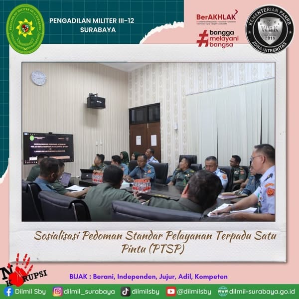 Pada tanggal 19 November 2024 telah dilaksanakan kegiatan Sosialisasi Pedoman Standar Pelayaaan Terpadu Satu Pintu (PTSP) berdasarkan Keputusan Direktur Jenderal Badan Peradilan Militer dan Tata Usaha Negaran Nomor 203/DJMT/SK.OT1.2/XI/2024 tanggal 8 November 2024 Tentang Pedoman Standar Pelayanan Terpadu Satu Pintu (PTSP) di Lingkungan Peradilan Militer. Kegiatan sosialisasi dipimpin oleh Wakil Kepala Pengadilan Militer III-12 Surabaya Letnan Kolonel Kum Jonarku, S.H.,M.H. yang diikuti seluruh personel Pengadilan Militer III-12 Surabaya.