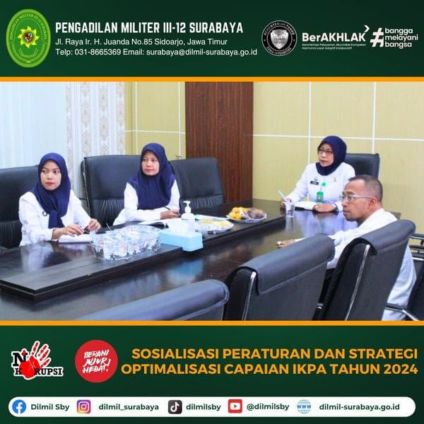 Sekretaris Pengadilan Militer III-12 Surabaya beserta Kasubbag Umum dan Keuangan, PPSPM, serta Bendahara mengikuti Sosialisasi Peraturan dan Strategi Optimalisasi Capaian IKPA Tahun 2024 Satuan Kerja di Lingkungan Direktorat Jenderal Badan Peradilan Militer dan Peradilan Tata Usaha Negara. Kegiatan ini dilaksanakan secara daring di Ruang Command Center Pengadilan Militer III-12 Surabaya.