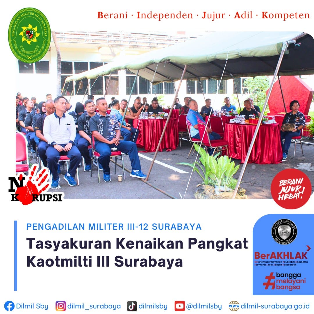 Hakim Militer Letkol Kum Wing Eko Joedha H., S.H., M.H. beserta Mayor Laut (H) Mirza Ardiansyah, S.H., M.H., M.A.P mewakili Kepala Pengadilan Militer III-12 Surabaya menghadiri kegiatan tasyakuran kenaikan pangkan Kaotmilti III Surabaya Laksamana Pertama TNI Dr. Imam Subekti, S.H., M.H. Kegiatan ini dilaksanakan di halaman depan kantor Otmilti III Surabaya